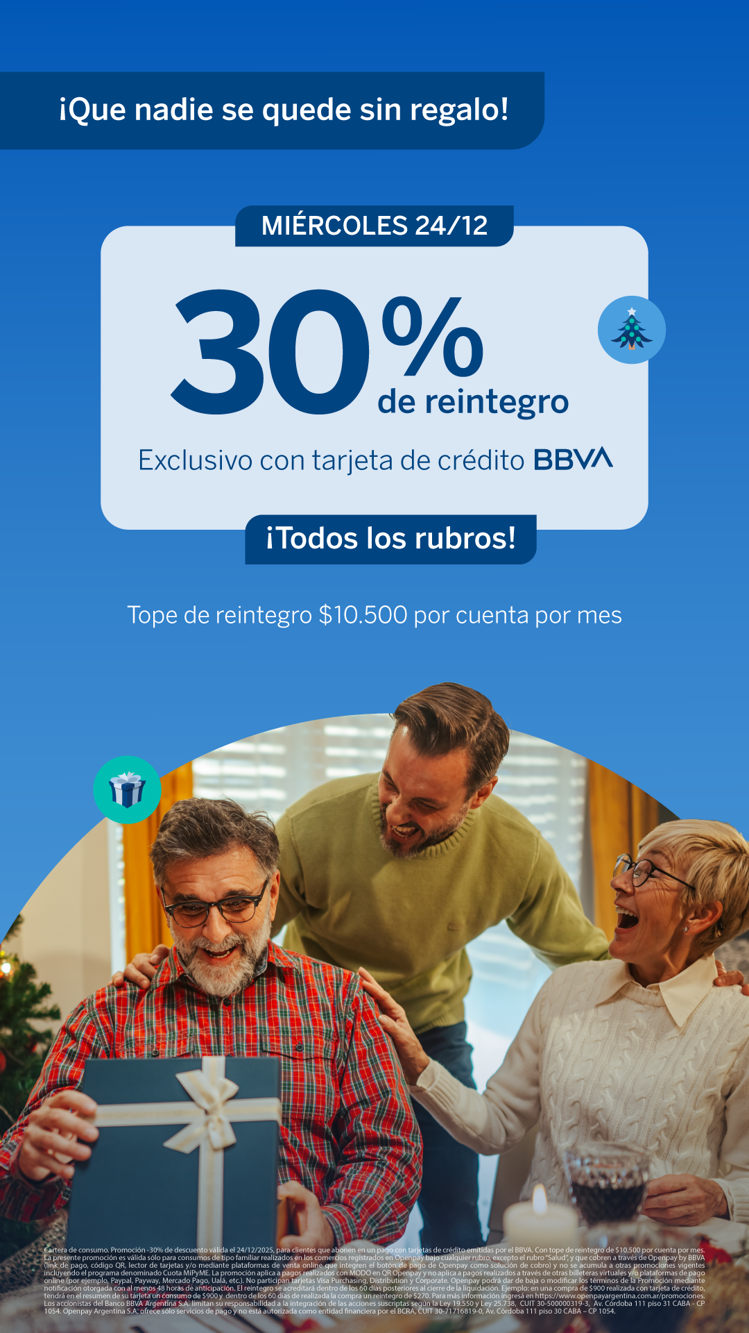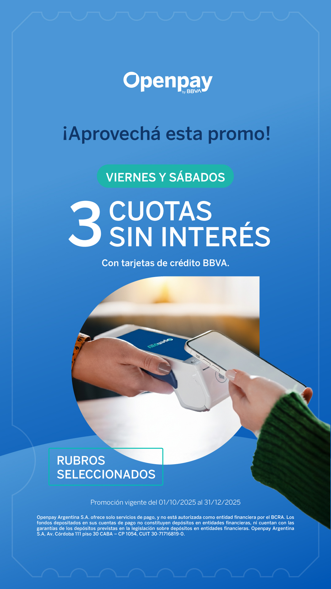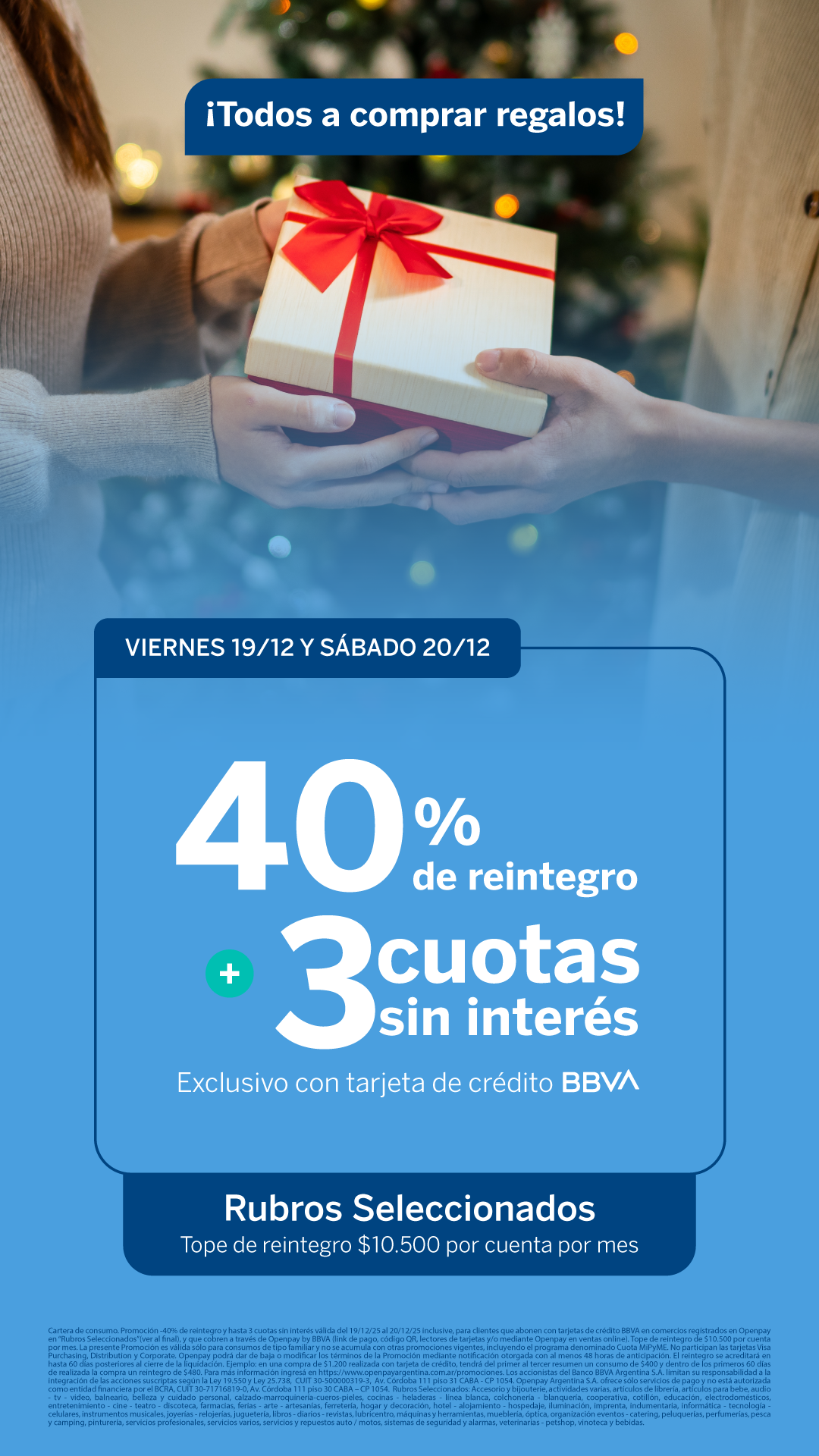Esta promoción permite ofrecer un reintegro de 40% del valor de la compra y hasta 3 cuotas sin interés a clientes que abonen con tarjetas de crédito BBVA en comercios que cobren con Openpay (link de pago, QR, lector de tarjetas Openpay Mini, Openpay Smart y/o mediante plataformas de venta online que integren el botón de pago de Openpay como solución de cobro) el 19 y 20 de diciembre de 2025. La promoción tiene un tope de reintegro de $10.500 por cuenta por mes.