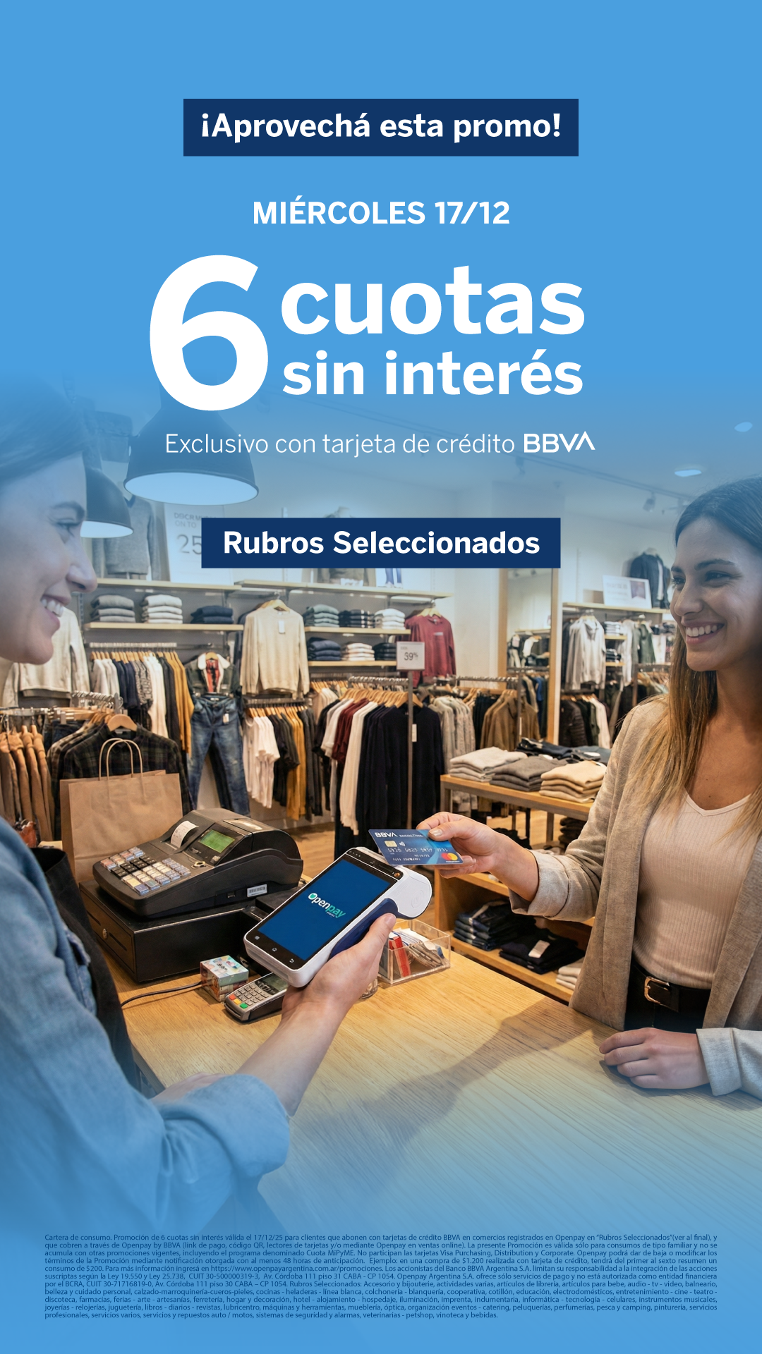 Esta promoción permite ofrecer 6 cuotas sin interés a clientes que abonen con tarjetas de crédito BBVA en comercios que cobren con Openpay (link de pago, QR, lector de tarjetas Openpay Mini, Openpay Smart y/o mediante plataformas de venta online que integren el botón de pago de Openpay como solución de cobro) el 17 de diciembre de 2025.